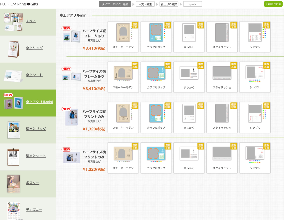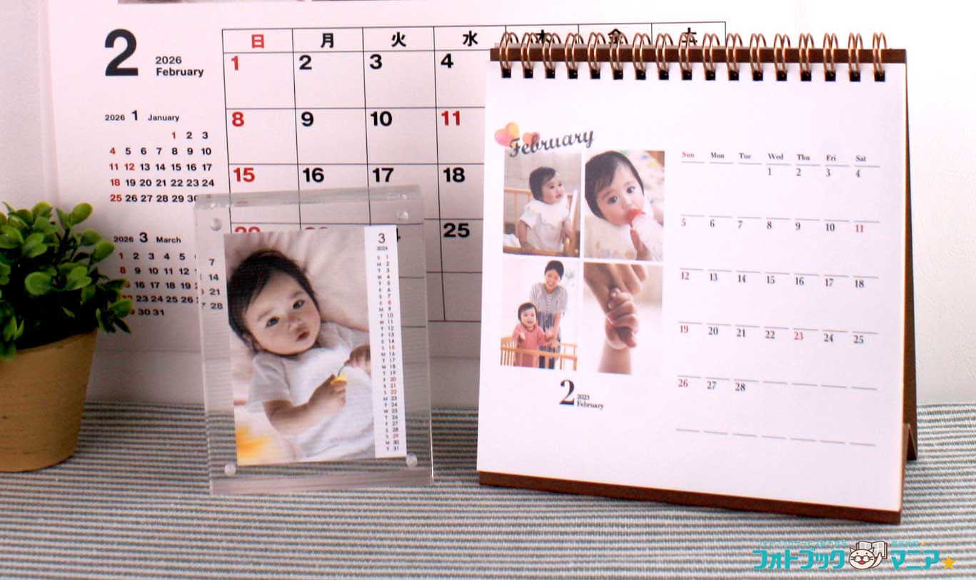 アクリルminiのフレームセットは3,410円と、卓上カレンダー(1,540円~)の約2倍の価格です。しかし、透明アクリルフレームは長く使えるため、2年目以降はプリントのみ(1,320円)で済みます。