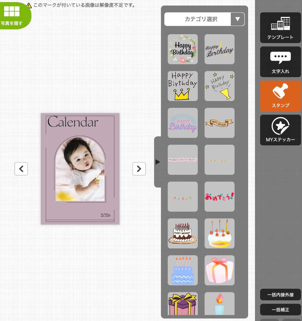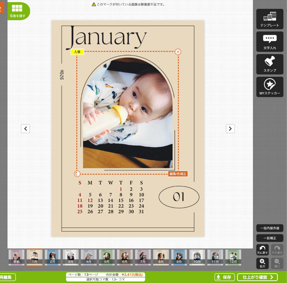 編集画面の下部には、全13ページ(表紙+12ヶ月)のサムネイルが表示されます。各月をクリックすれば、その月のページに移動して、写真やテンプレートを自由に変更でき、飽きることなく楽しく編集できます。