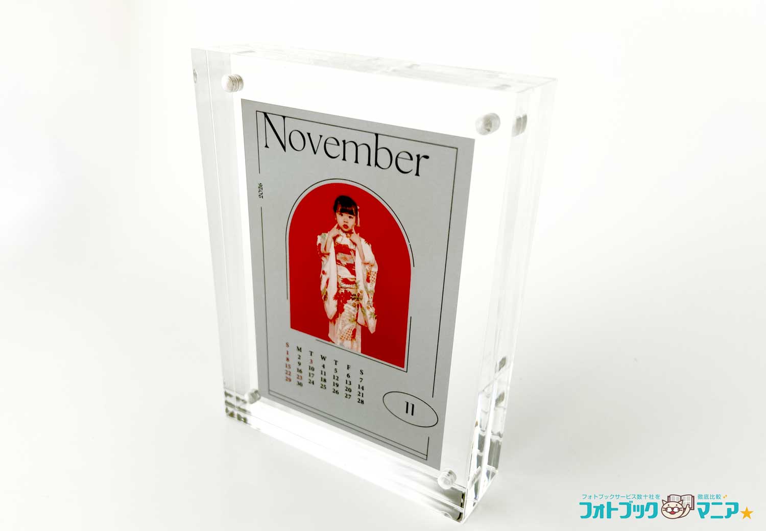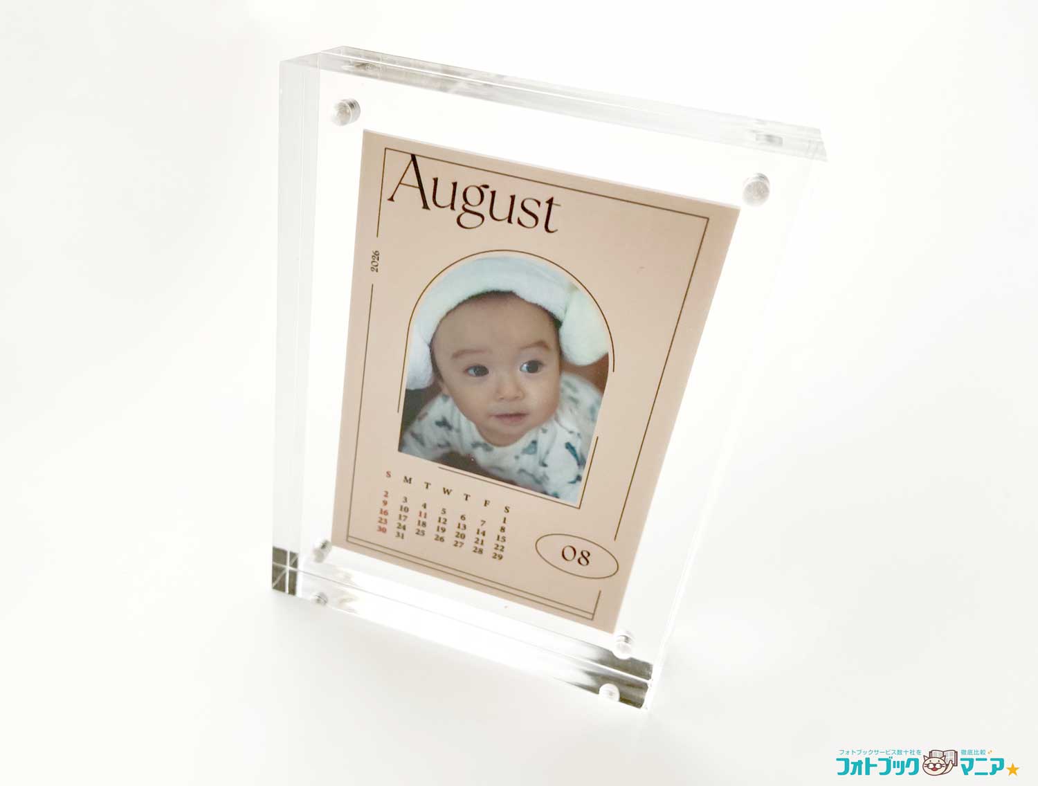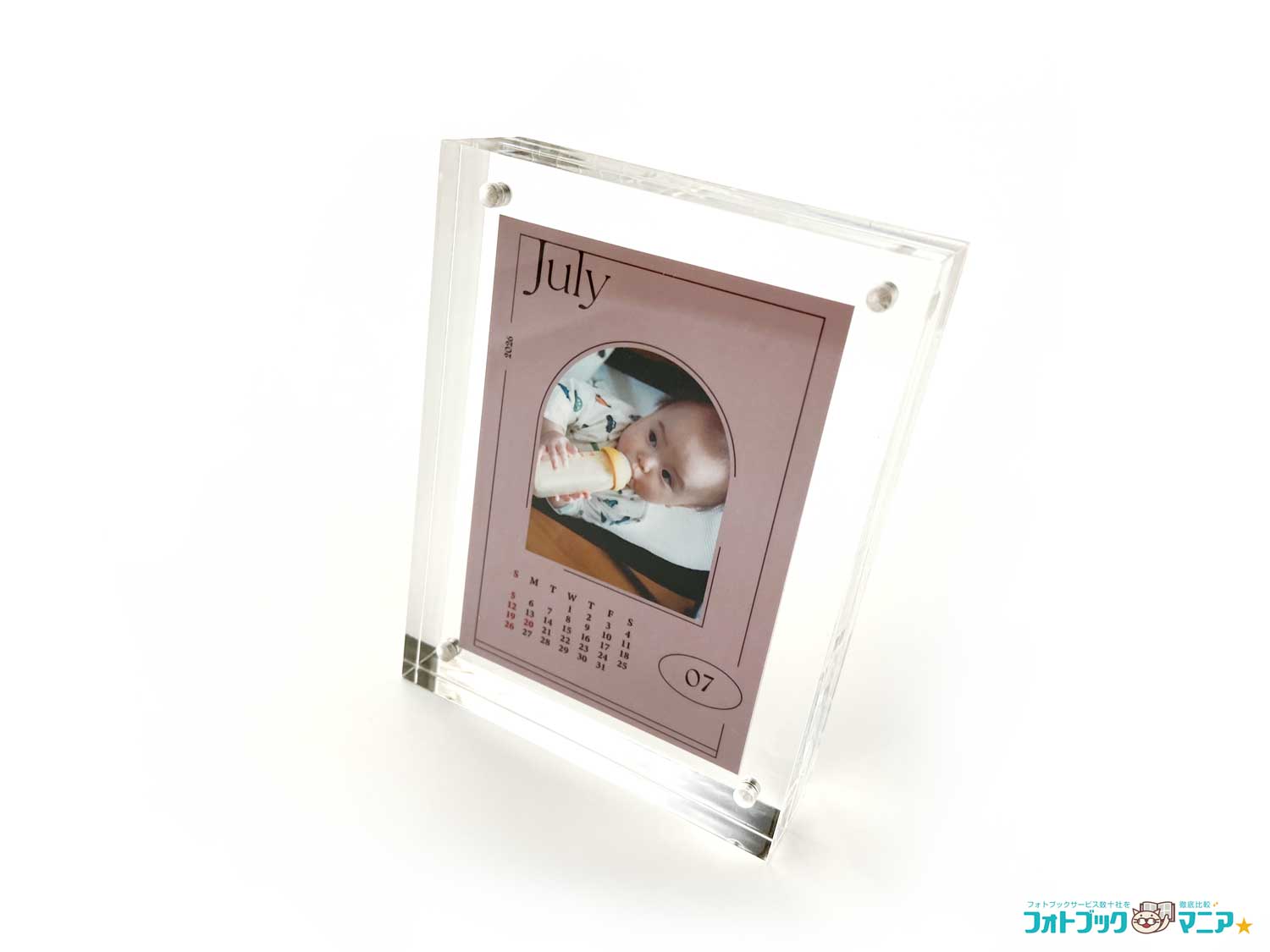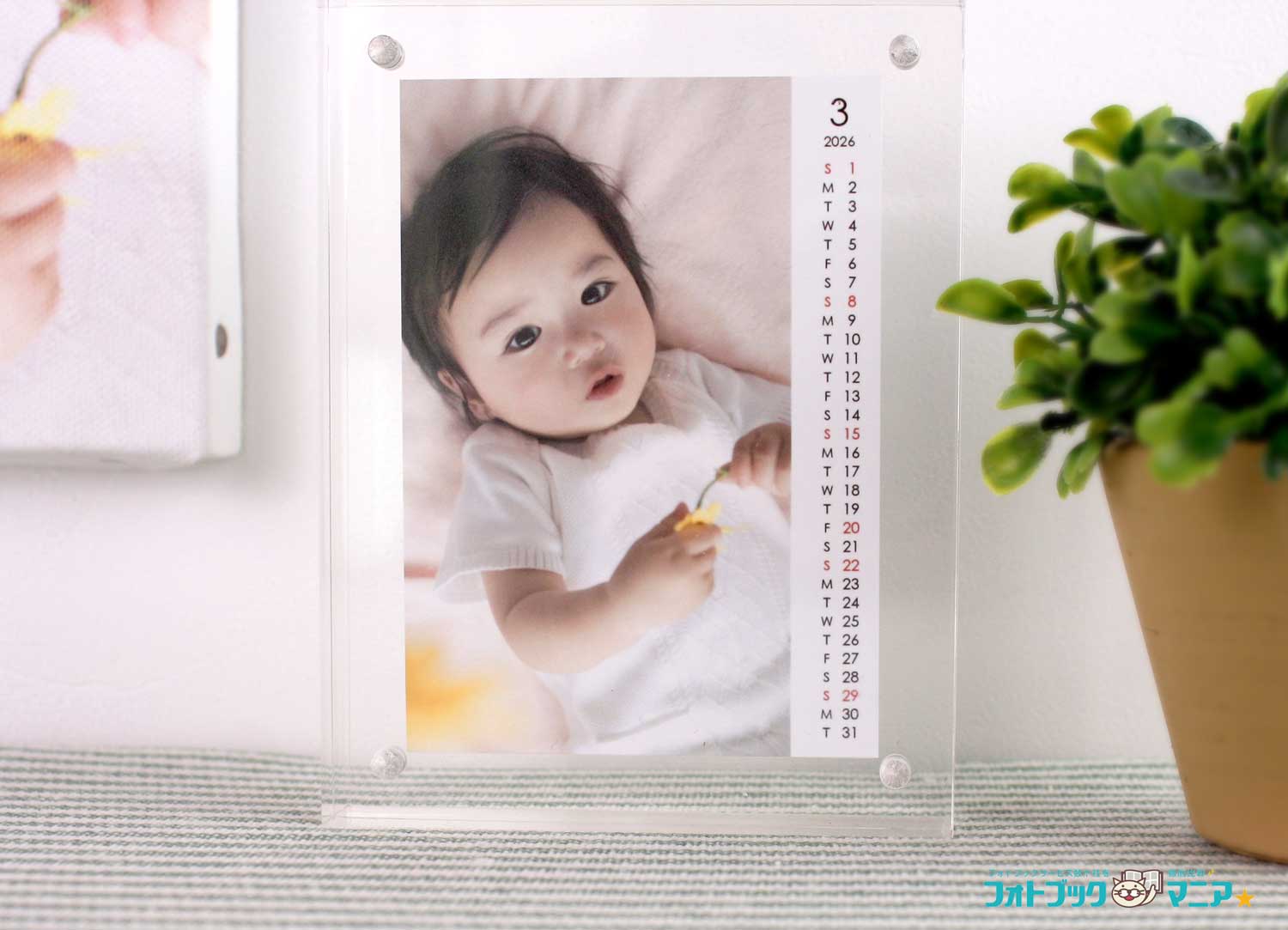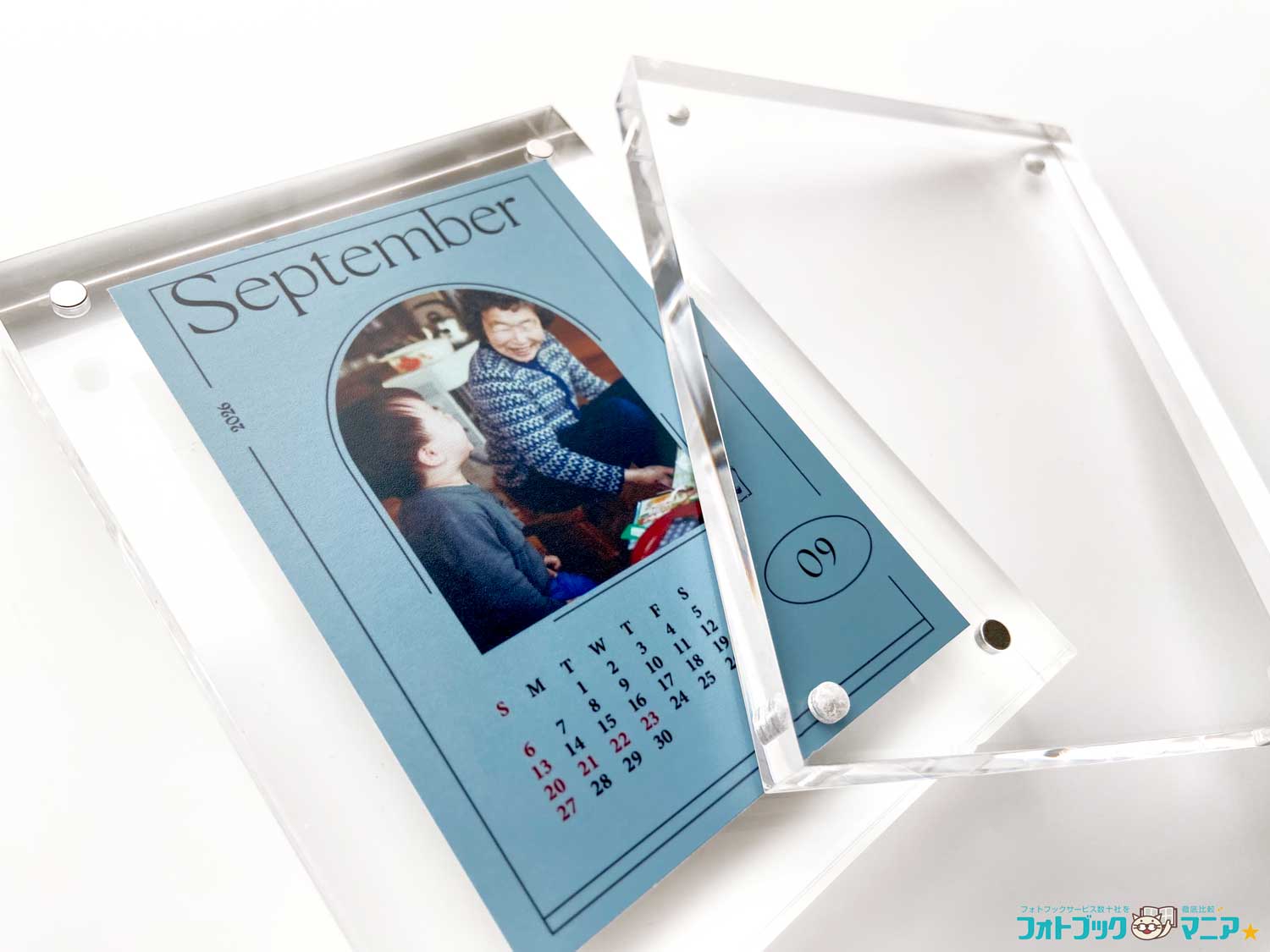 卓上カレンダーよりもさらにコンパクトで洗練されたデザインで、厚みのあるアクリル板に写真を挟んで飾るフォトフレームとして、カレンダーが終わった後も長く使えるのが特徴です。
