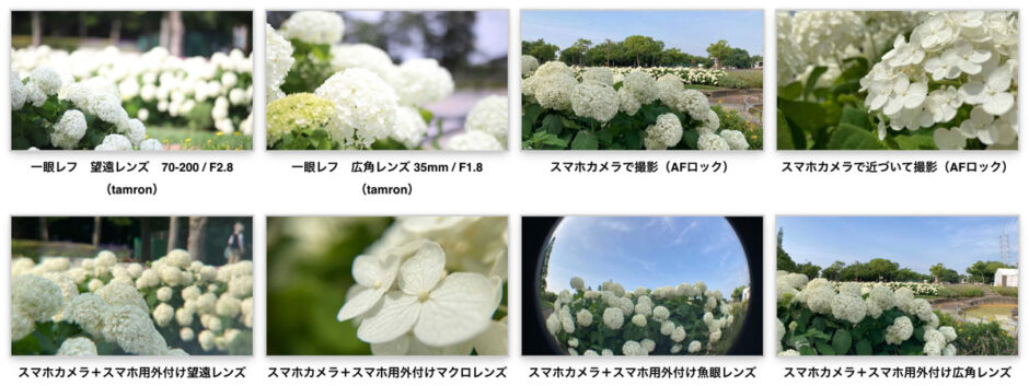 今回はアナベルを被写体にして検証したので、あまり魚眼レンズの効果を実証できませんでしたが、建物などを被写体にしたら魚眼レンズのゆがみを体感できるかもしれません。