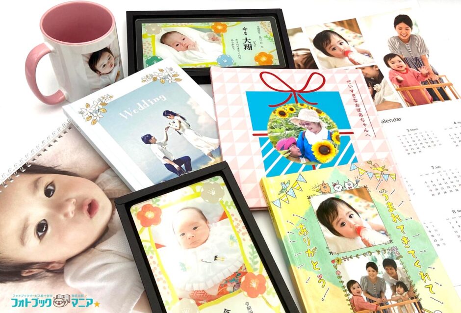 写真入りプレゼントにできる商品は、定番のフォトブックやフォトフレームだけでなく、マグカップ・時計・Tシャツなどの身近なものから、ケーキやお米などの食品までその幅は広がっています。