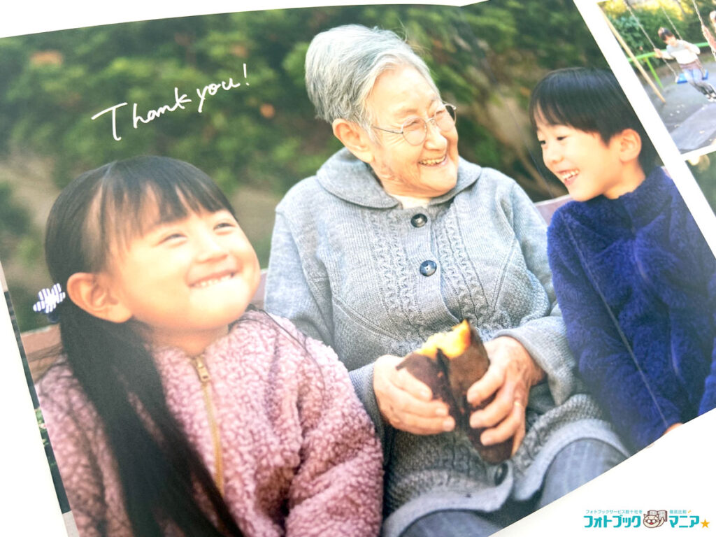 半透明ケース付きなので、そのまま手渡せます。特に祖父母へ孫の写真を贈ると喜ばれます。別売ラッピング袋(165円)を追加すれば完璧。上掲のレイアウトでは、写真の上に「thank you」のスタンプを押しました。