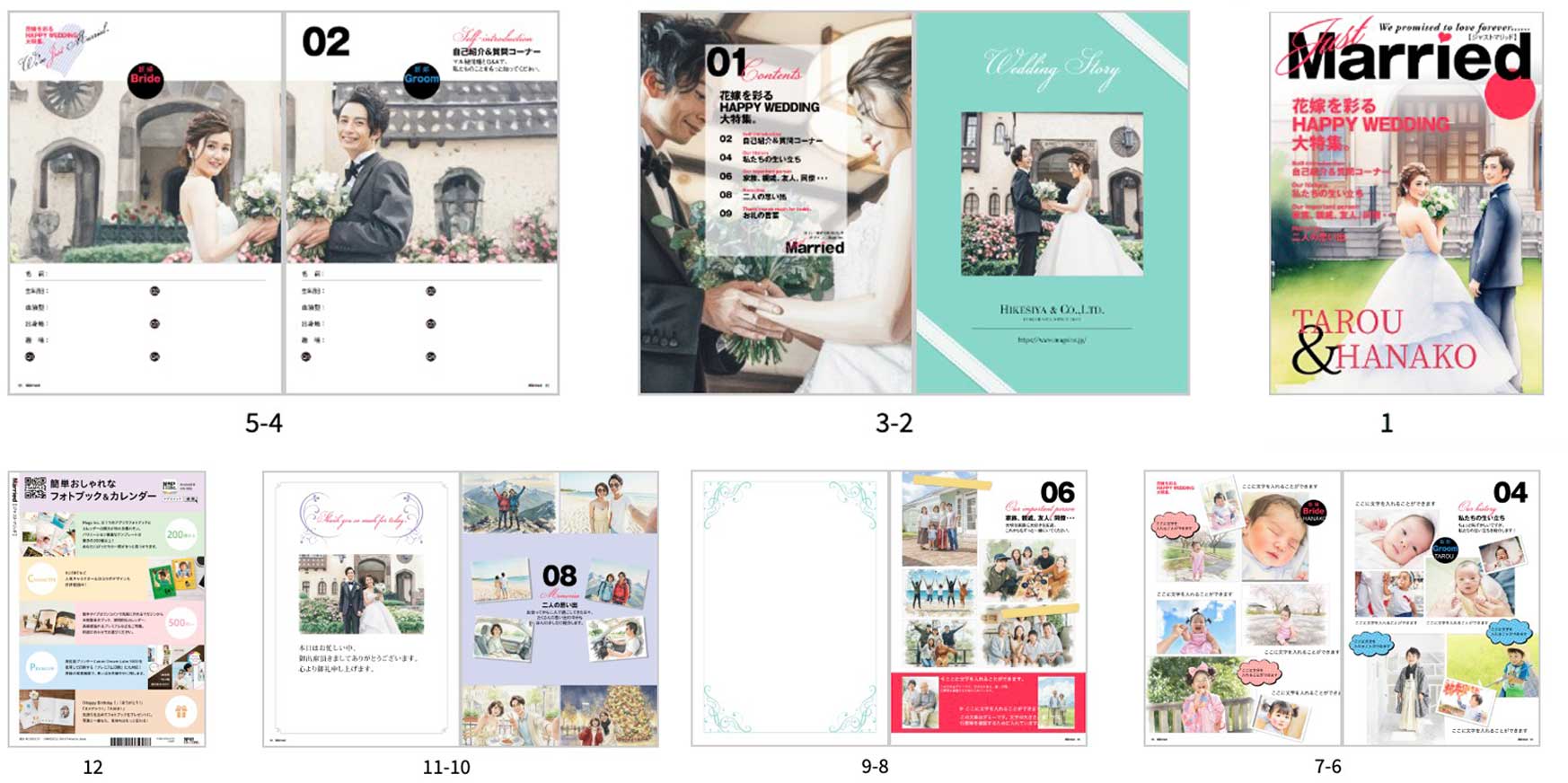 日常的なスナップ写真を選んで作る写真アルバムや子供の成長記録はもちろんのこと、スタジオ撮影の記念写真をメインにした七五三や結婚式の記念写真集などもテンプレートで作ることができます。
