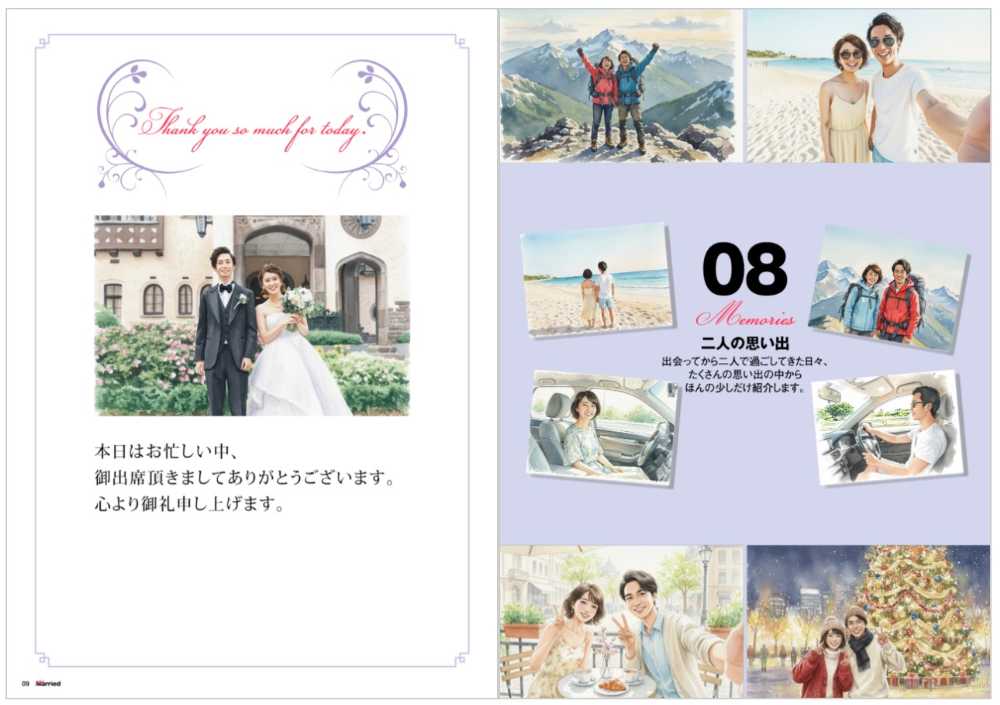レイアウト例に使用した画像は、写真素材からAIでバリエーションを出し水彩風の加工にしましたが、「写真」の掲載されたプロフィールブックをゲストに配るのが、少し恥ずかしい場合は、このように水彩風の加工でプロフィールブックを作るのもおすすめです。