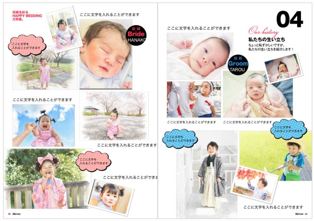 写真素材を組み合わせて「Just Married 〜プロフィールブック〜」のレイアウト例を実際に作成してみました。