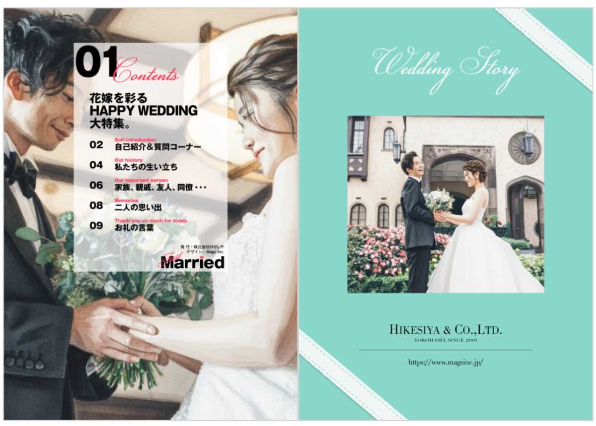 表紙はシンプルで上品な「Married」の文字デザイン。新郎新婦の名前を入れるとぐっと特別感が出ます。