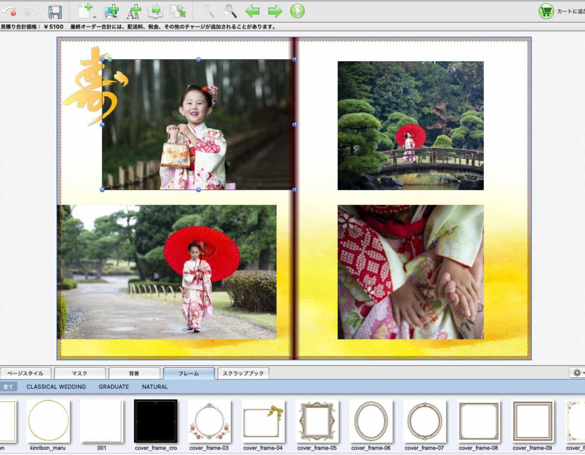 操作画面下部の「ページスタイル」タブに見開きのデザインテンプレートがあります。女の子向けの可愛らしい装飾や、旅行やウエディング向けのデザインなど、シーンに合わせたデザインが選べます。